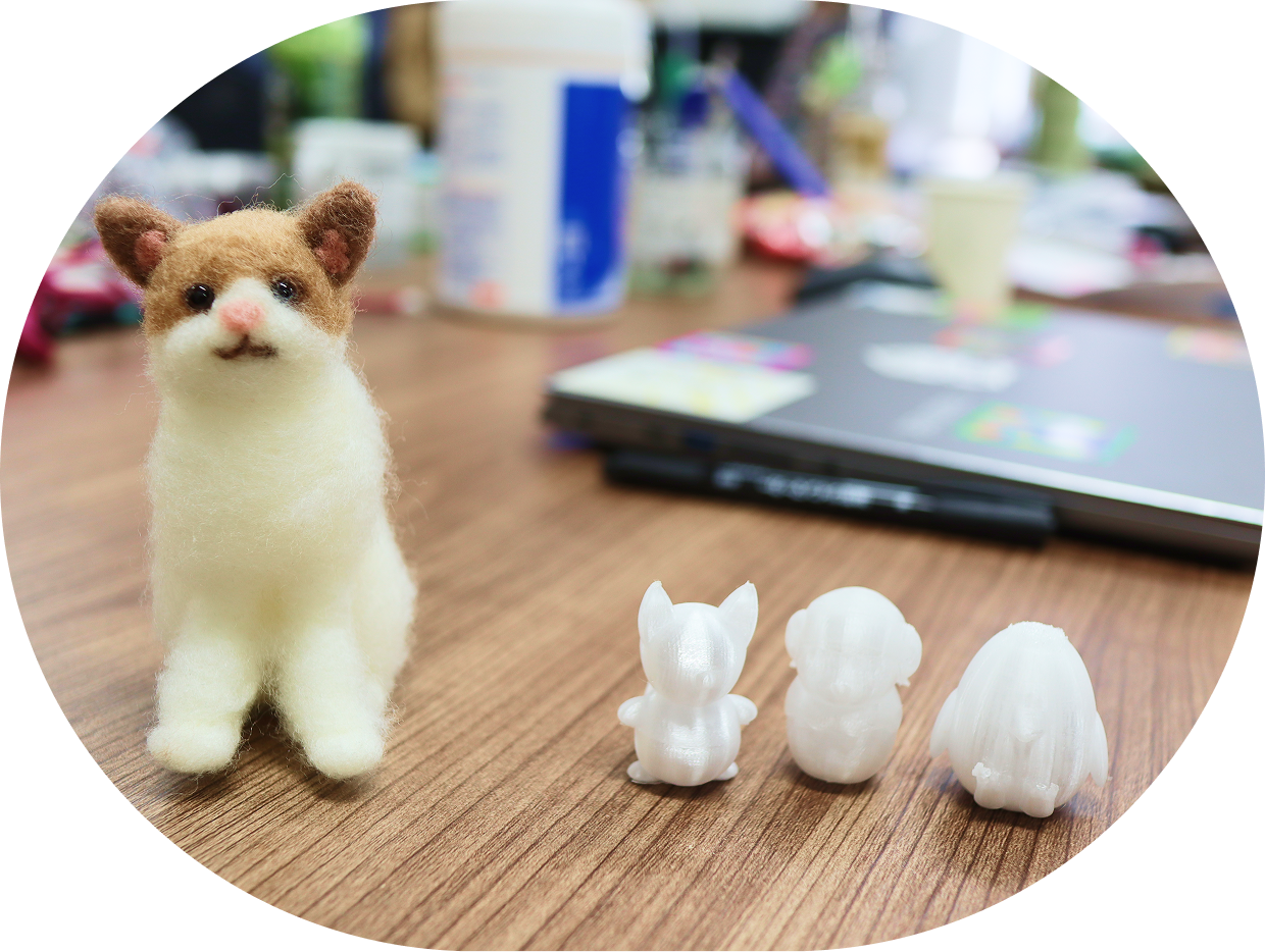 右:モデリングしたデータを3Dプリンターで印刷した動物たち