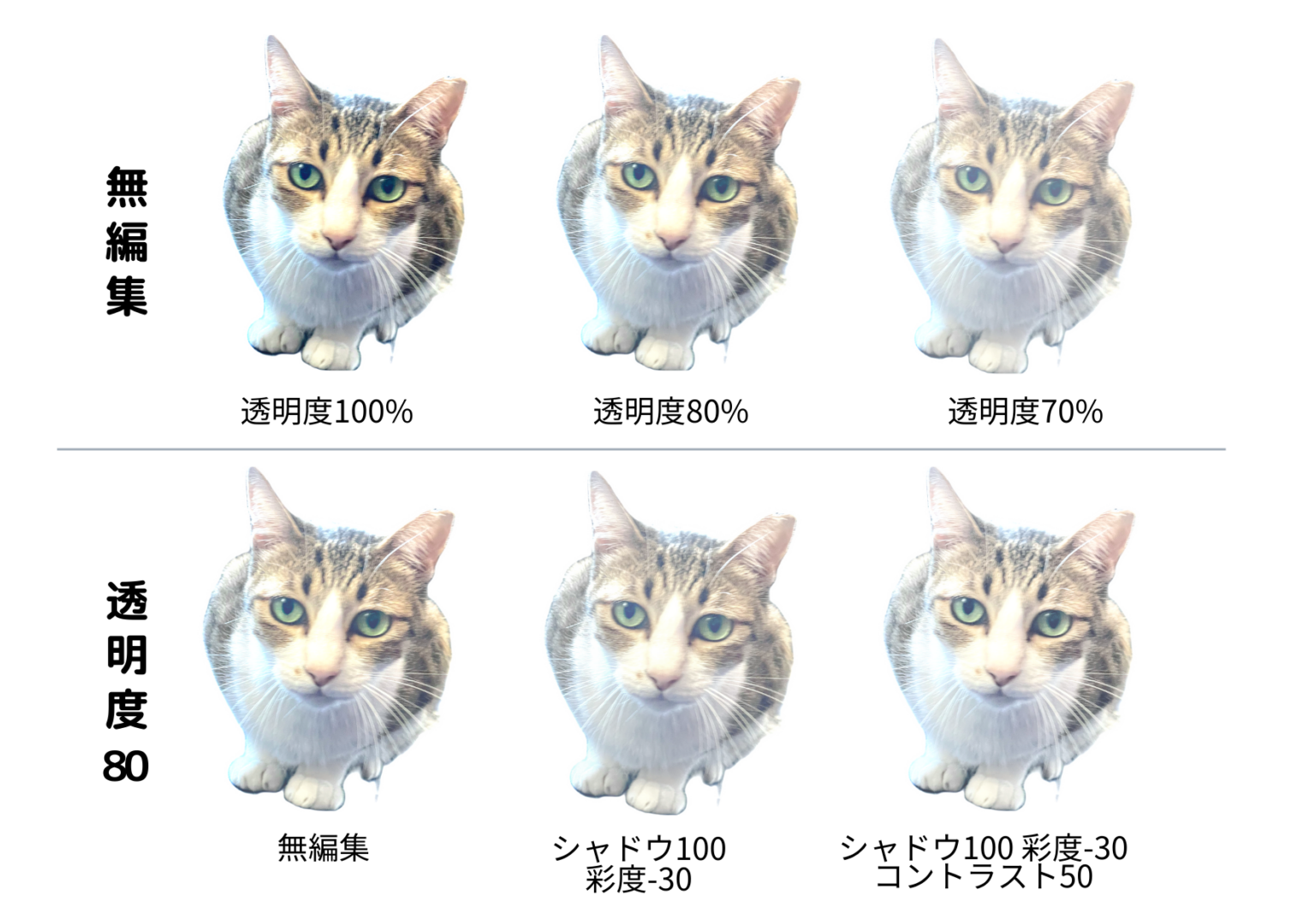 特に黒色は濃く出るので、黒猫など全体が黒い場合は、透明度50%でも良いくらいです。