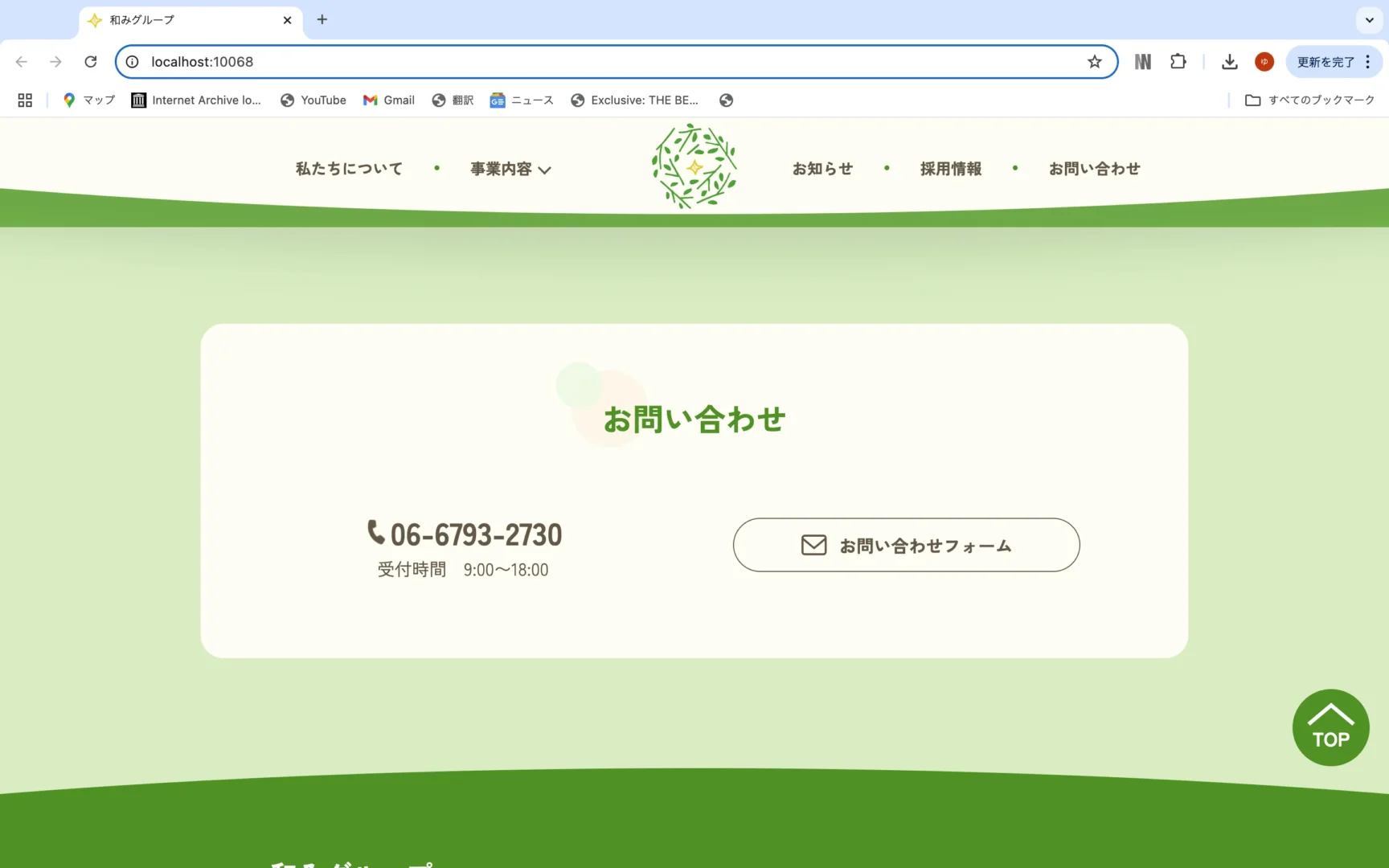 すると、サイトの見た目は変わらないと思いますが、お問い合わせのセクションを別ファイルから呼び出して表示されるようになりました。他にも共通化したいパーツがあった場合は、以上の手段で共通化することが可能なので、覚えておきましょう。