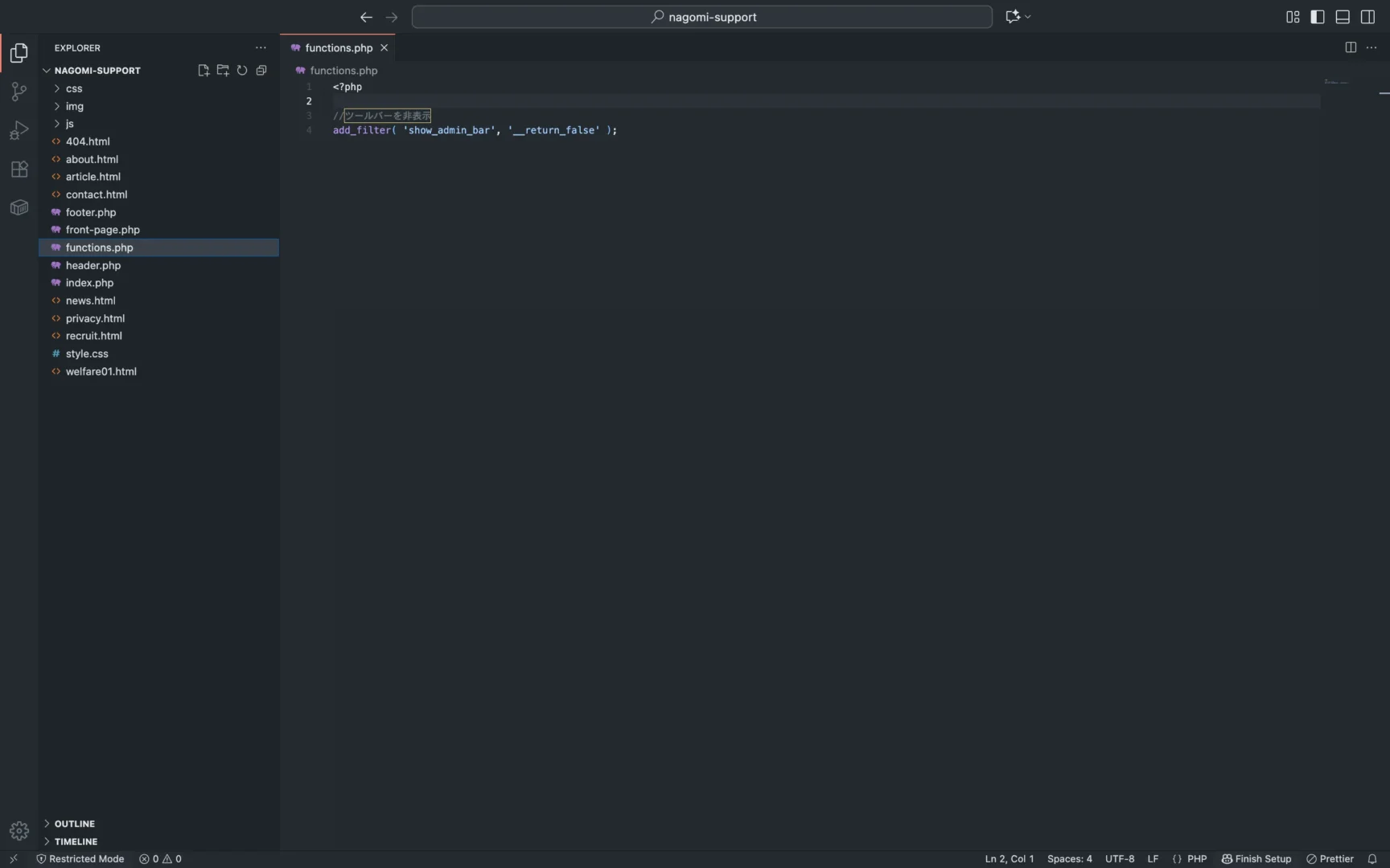 functions.phpに書き込む方法でも、管理画面を操作する方法でも同じくツールバーを消すことができますが、今回はfunctions.phpの方で消しておきましょう。functions.phpで消す方が複数人でサイトを開発するときに全員に反映されるので便利ですし、functions.phpファイルは今後も使うので、今のうちに作成して使い方を覚えておきましょう。
