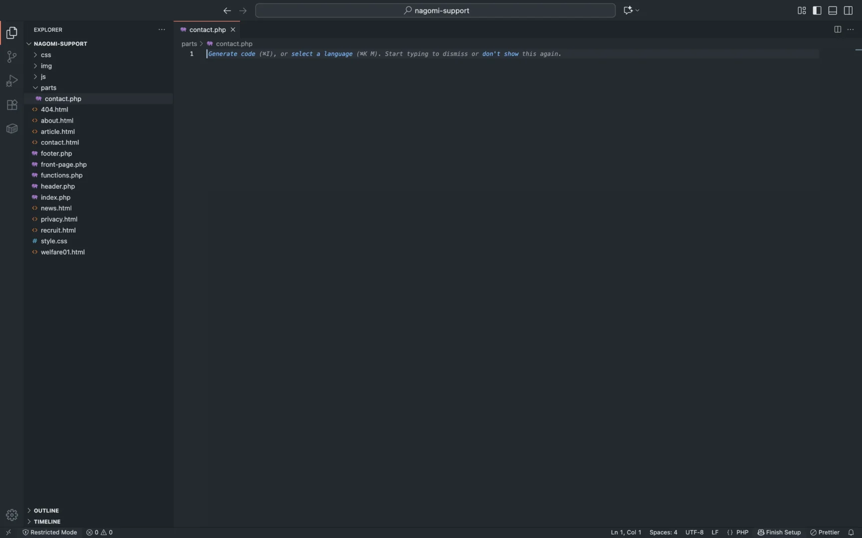 まず、テーマファイルの直下に、partsというフォルダを作成して、そのフォルダ内にcontact.phpというファイルを作成します。
