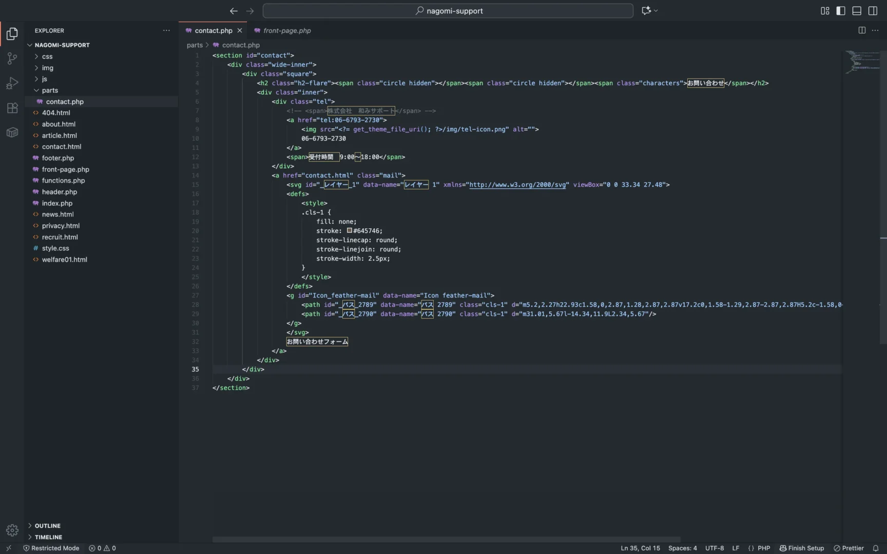 そしてfront-page.php内の「お問い合わせ」のセクションをコピーして、以下のようにcontact.phpにペーストしましょう。
