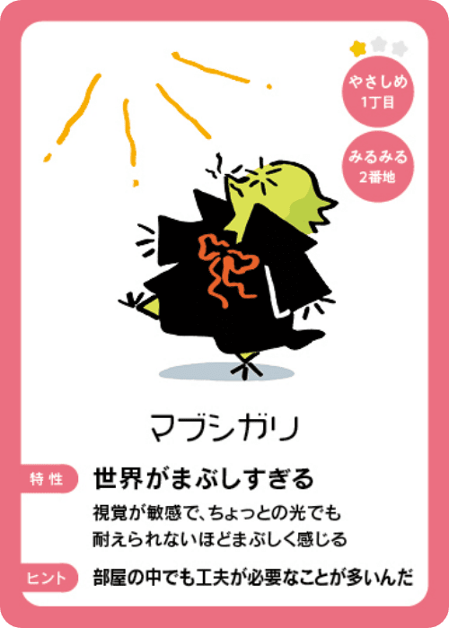 まなみちゃんピックアップした”ココ・キニナール”か、それ以外で当てはまるのは…”マブシガリ(視覚が敏感)”とかくらいかな?