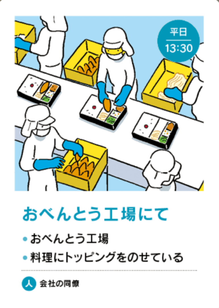 えっちゃん最初の場面カードは…”お弁当工場にて 平日13:30“か~。じゃあ、「あなた(住民)は単純作業で困ったりしますか?」