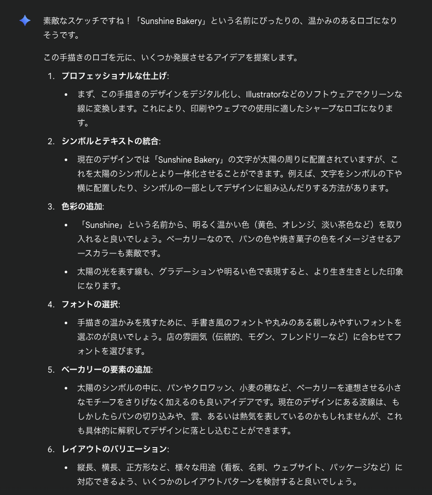 「手書きでベーカリーのロゴを描いてみたんですが、どう発展させればいいでしょうか?」と画像付きでAIに相談してみました。